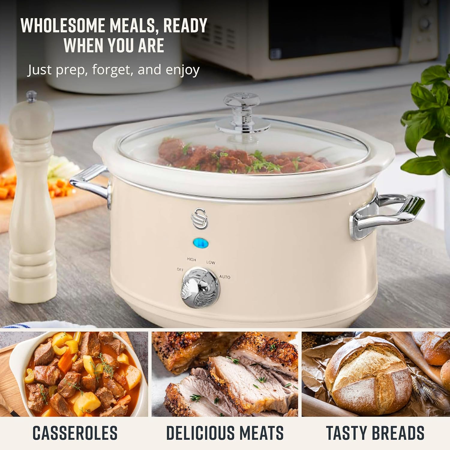 The perfect solution for the busy cook, the 3.5 litre Slow Cooker allows you to prepare and cook meals in advance and three heat settings allow you to create delicious, slow cooked meals, packed with flavour. The Swan Retro 3.5 litre slow cooker with its stylish retro design, makes the perfect feature in any kitchen whilst also being incredibly functional and useful. The generous 3.5 litre capacity allows enough space to cook plenty of food for you and your partner, or for weeknight family meals, without taking up too much space on your countertop. The removable non-stick ceramic inner pot allows for easy and hassle-free serving and cleaning. Simply lift out the dish when you’re ready to serve and carry it to the table, then when you’re finished it can be placed in the dishwasher for quick, efficient cleaning without the mess. With varying heat settings, you can easily change the cooking settings to suit your needs. The low heat setting gently simmers food for an extended period of time without overcooking or burning it, and no stirring is required. This is perfect for cooking meals overnight, or whilst you’re working or going about your day, so you can come back to a delicious meal that is ready to eat. Also great for when reheating foods, so as not to overcook them. The high heat setting is great for baking, and for when you want to cook your dishes much faster, as it cooks in half the time required for the low heat setting. The auto setting is the most popular setting for slow cookers, as it cooks on high at first, then switches to low for the remainder of the cooking time to ensure everything is thoroughly cooked and packed with flavour. The innovative keep warm function is great for keeping your dishes from going cold or overcooking and drying out if someone going to be delayed, or will be eating later when they get in from work. It keeps your meal at the perfect temperature for when you’re ready to serve, so people can help themselves when they are ready to eat, or go back for seconds.