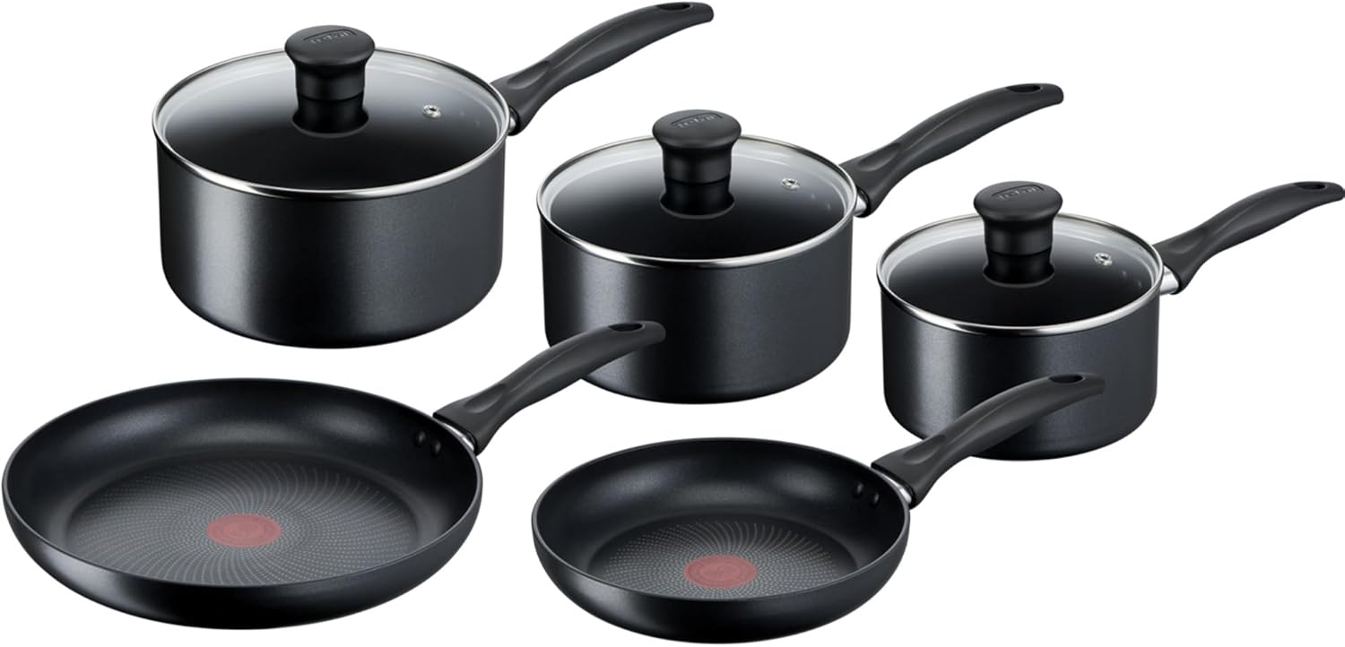 Cook with confidence using the Tefal Induction Cookware Set, designed to make everyday meals easier and more enjoyable. Each piece features Tefal’s highly durable Titanium non-stick coating, reinforced for long-lasting performance and effortless clean-up—no sticking, no scrubbing. Advanced Thermo-Fusion™ induction technology ensures rapid heat-up and perfectly even heat distribution across the pan surface, delivering consistently great results on every hob type. The smart Thermo-Signal™ heat indicator turns solid red when the pan is at the ideal cooking temperature—taking the guesswork out of preheating. Each saucepan comes complete with a glass lid, allowing you to monitor your food without lifting the lid—locking in flavour and moisture while preventing burning or drying out. This versatile 5-piece set is compatible with all hob types, including induction. Set includes: • 16 cm, 18 cm and 20 cm saucepans with lids • 22 cm and 26 cm frying pans